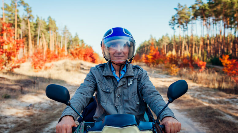 Senior man riding scooter on autumn forest road. Happy driver in helmet riding moped.